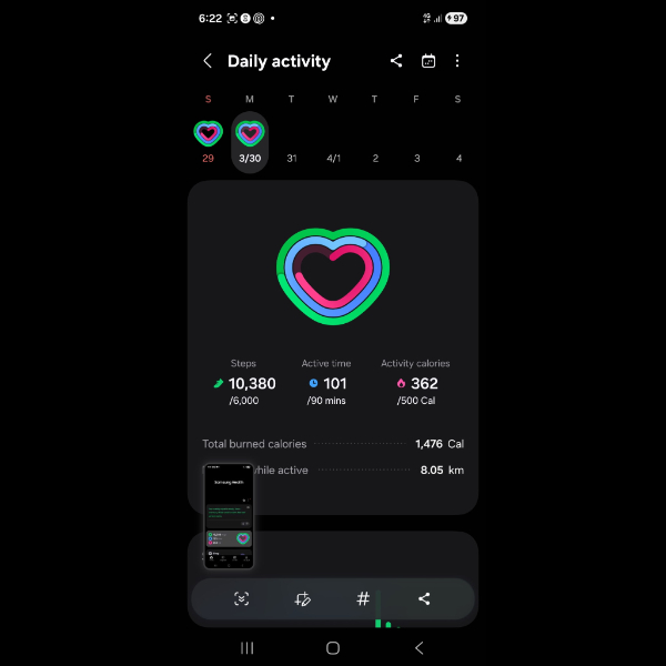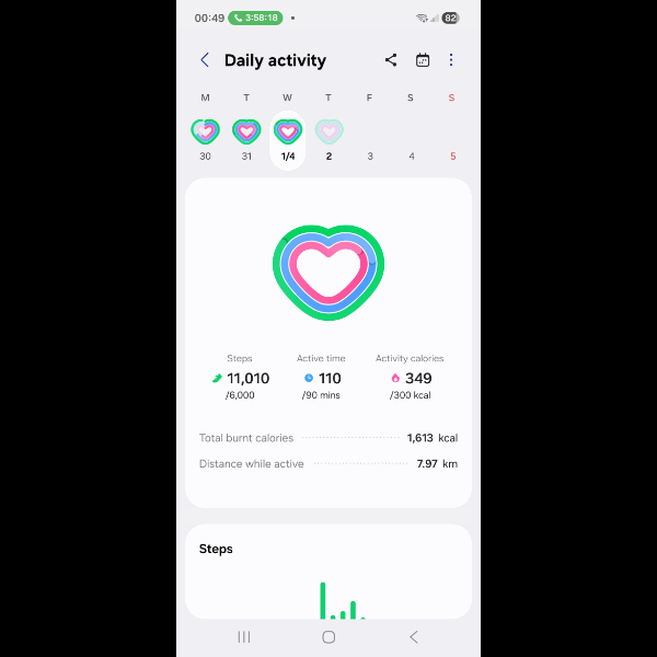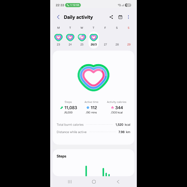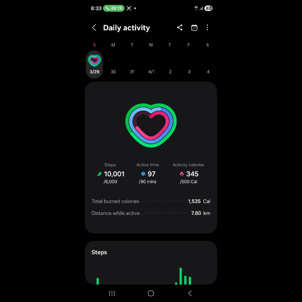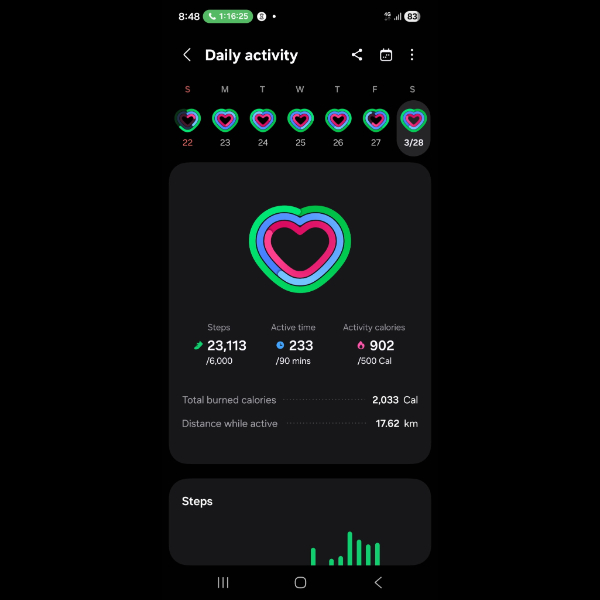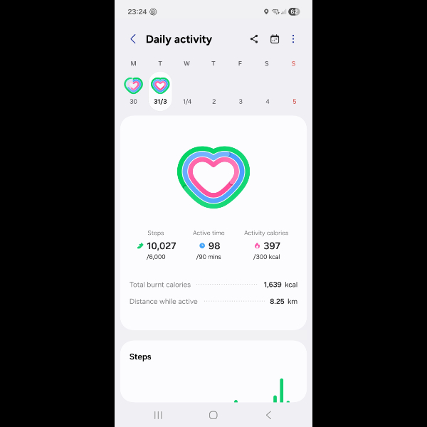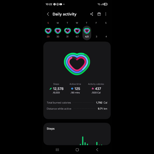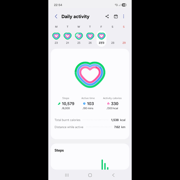My tracker shows my steps for the 8 days of the challenge from 26th March to 2nd April. My goal progression shows all my steps including any I have done outside of the challenge days.