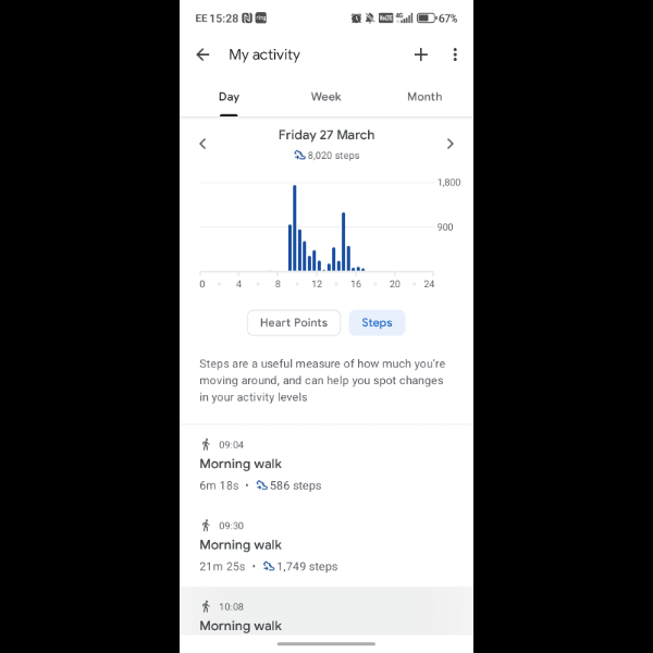 My tracker shows my steps for the 8 days of the challenge from 26th March to 2nd April. My goal progression shows all my steps including any I have done outside of the challenge days.