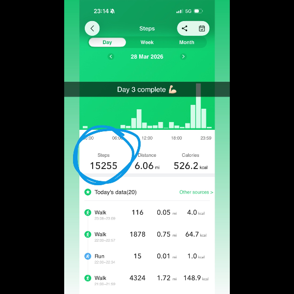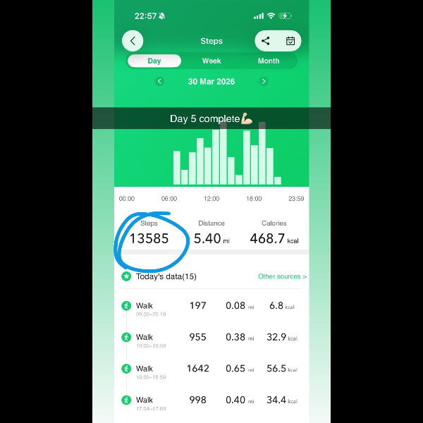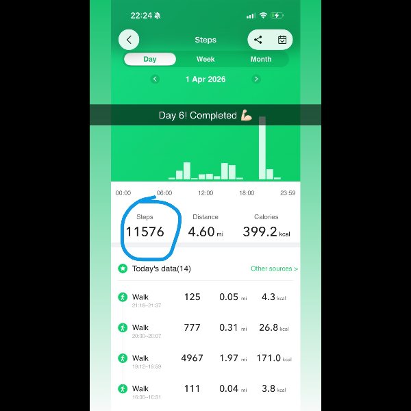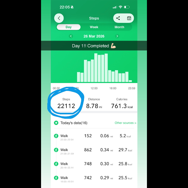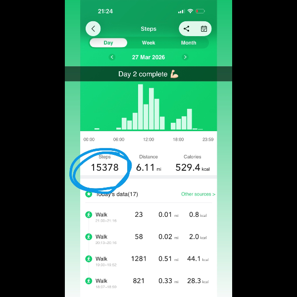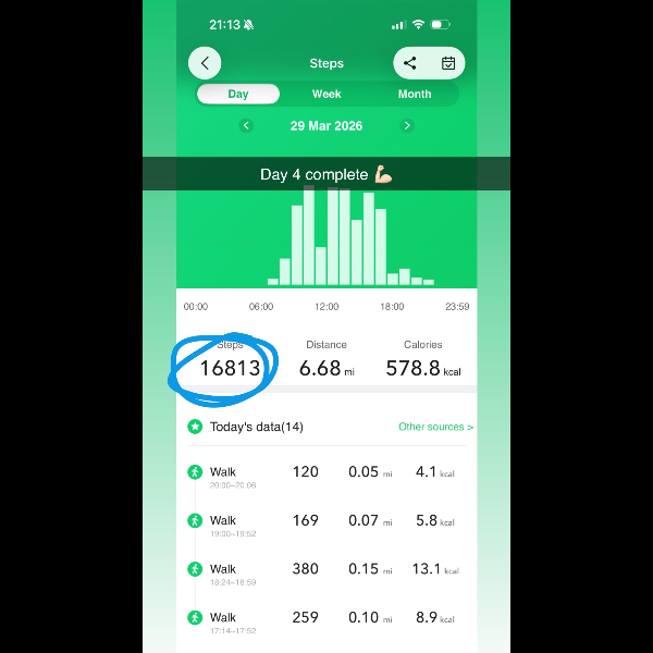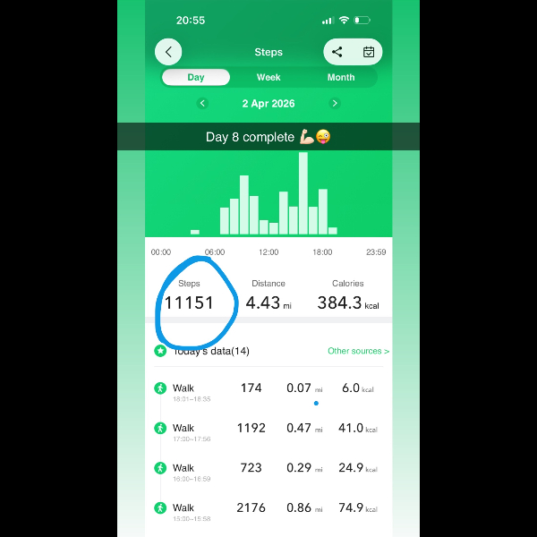 My tracker shows my steps for the 8 days of the challenge from 26th March to 2nd April. My goal progression shows all my steps including any I have done outside of the challenge days.