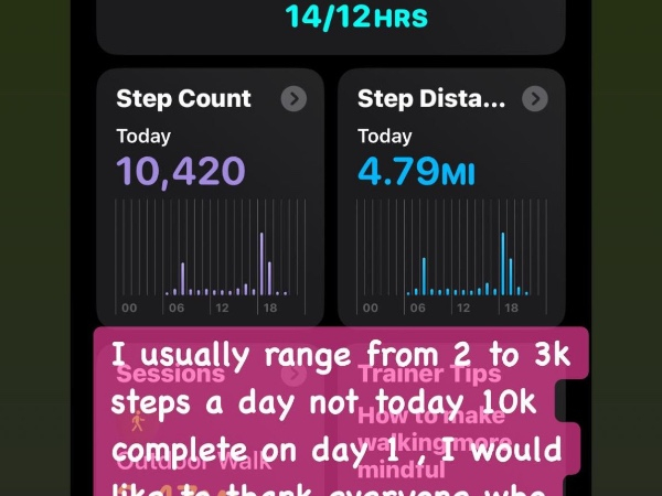 My tracker shows my steps for the 8 days of the challenge from 26th March to 2nd April. My goal progression shows all my steps including any I have done outside of the challenge days.
