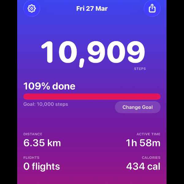 My tracker shows my steps for the 8 days of the challenge from 26th March to 2nd April. My goal progression shows all my steps including any I have done outside of the challenge days.