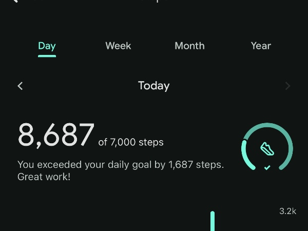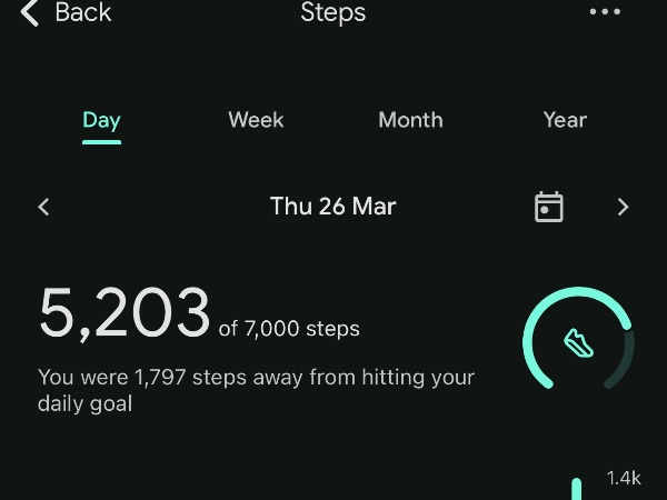My tracker shows my steps for the 8 days of the challenge from 26th March to 2nd April. My goal progression shows all my steps including any I have done outside of the challenge days.